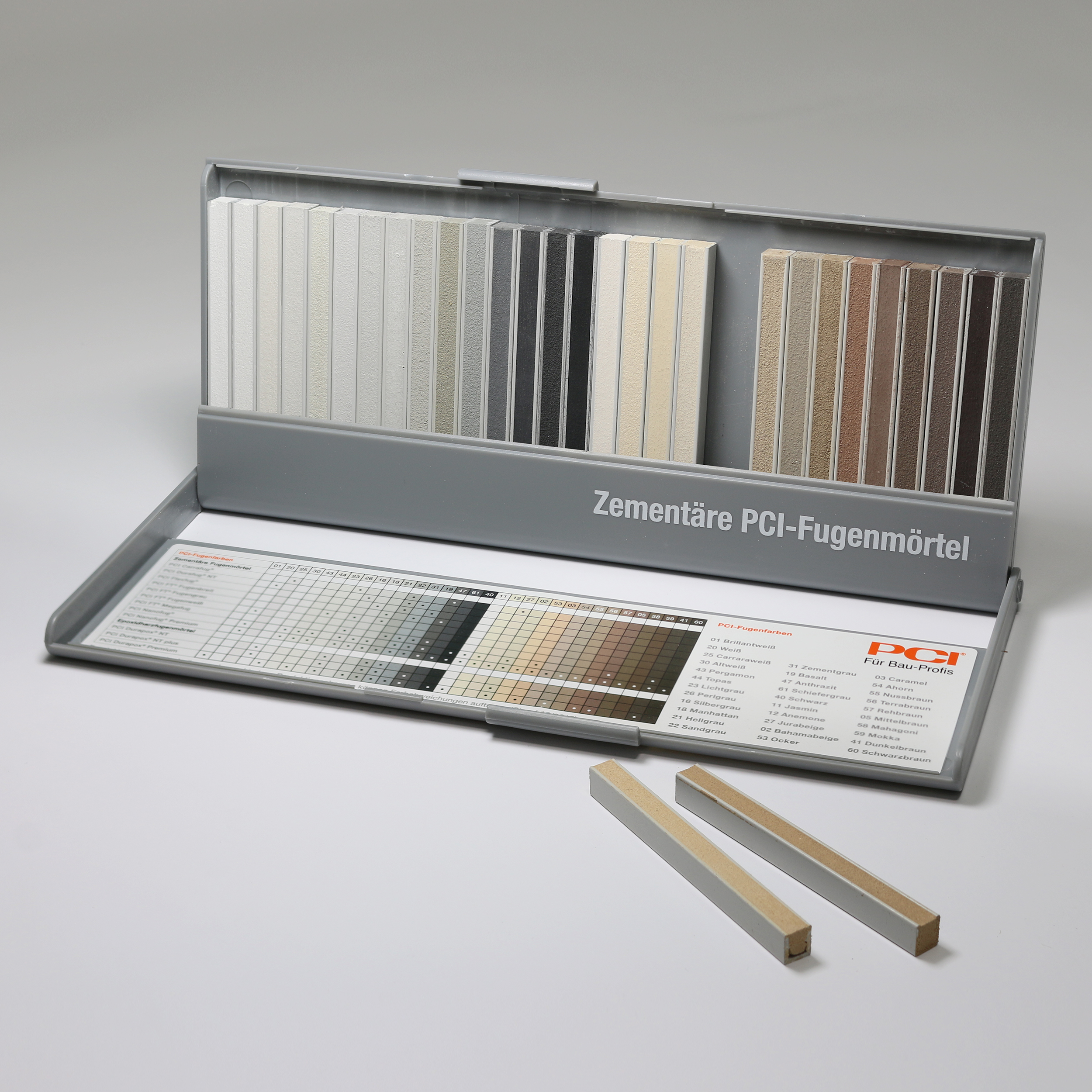 Fugenmusterbox aus Hartplastik mit Aufstellfunktion. 30 Original-Einzelmuster, herausnehmbar. Inklusive Übersichtsmatrix mit allen verfügbaren zementären PCI-Fugenmörteln.